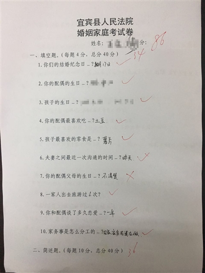 据成都商报9月21日消息,离婚之前,先做份考卷?9月14日,一份命题人是主审法官、评卷人是原、被告的“离婚考卷”在宜宾县人民法院观音法庭出现。法官称,通过让原、被告夫妻做题考试,可以对双方感情做一个考察,60分以上初步表明有挽回余地, 60分以下可以初步认定婚姻关系岌岌可危。