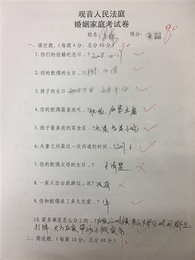 答完题后,试卷由夫妻双方彼此打分。最终,男方得分80分,女方得分86分。当天,在“成绩”出来以后,法院做出不准离婚的判决,双方均未表示上诉。“答完题后,女方态度平静了很多。”王士雨回忆。