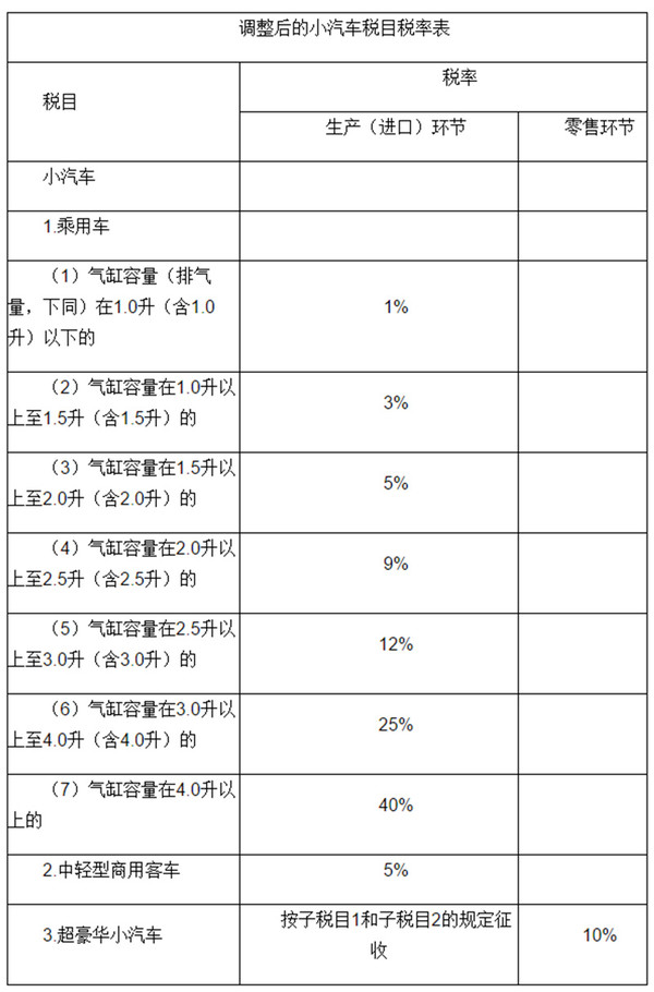 一、“小汽车”税目下增设“超豪华小汽车”子税目。征收范围为每辆零售价格130万元(不含增值税)及以上的乘用车和中轻型商用客车,即乘用车和中轻型商用客车子税目中的超豪华小汽车。对超豪华小汽车,在生产(进口)环节按现行税率征收消费税基础上,在零售环节加征消费税,税率为10%。