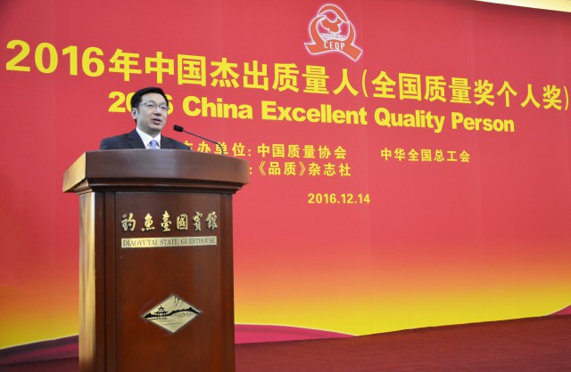 日期:12-15 来源:未知12月14日, 2016年中国杰出质量人(全国质量奖个人奖)颁奖庆典在北京钓鱼台国宾馆隆重举行,北新建材董事长王兵等10位企业家荣膺2016年“中国杰出质量人(全国质量奖个人奖)”。十届全国人大副委员长顾秀莲;九届、十届、十一届全国政协副主席白立忱;中国质量协会会长贾福兴等领导出席大会并为获奖者颁奖。