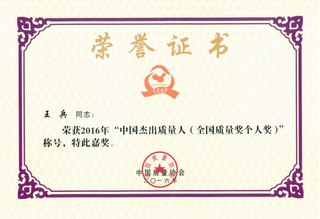 全国质量奖评审组委会给予王兵董事长高度评价:“以卓越的质量管理体系为基础,以品牌建设和技术创新为引擎,以卓越的运营管理为保障,打造了在质量、技术、效益方面全面超越外资品牌的中国好产品。”